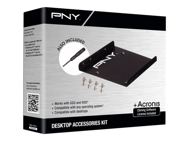 Description du produit PNY Desktop Accessories Kit - adaptateur pour baie de stockage Type de périphérique Adaptateur pour baie de stockage Supported Form Factor 3,5" à 2,5" Baies d'extension 1 x interne - 2.5" Baie compatible 1 3.5" -