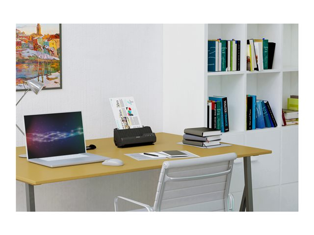 Lorsque ce scanner est utilisé en mode numérisation en « U », l'encombrement de l'appareil est idéal dans les espaces restreints. La connexion Wi-Fi offre un emplacement plus flexible. Compatible avec Windows, Mac, Chromebook, Android Mopria, Apple Airprint et l'application SmartPanel d'Epson.
