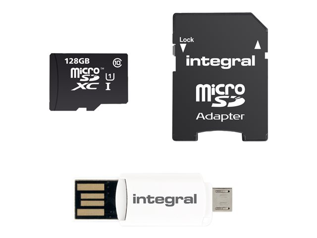 Description du produit Integral Smartphone and Tablet - carte mémoire flash - 128 Go - microSDXC UHS-I Type du Produit Carte mémoire flash Format Carte mémoire microSDXC UHS-I Capacité de stockage 128 Go Indice de vitesse Class 10 Adaptateur mémoire fourni Adaptateur microSDHC - SD Garantie du fabricant Garantie de 5 ans -